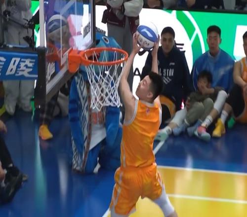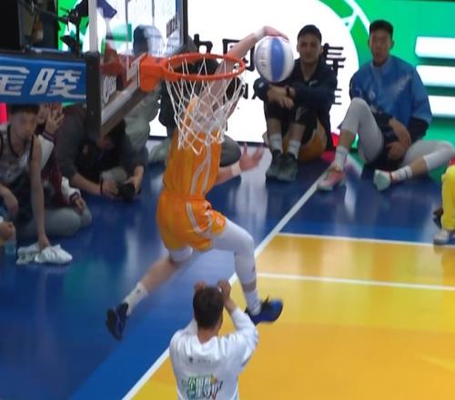 加赛张鼎岩选择飞跃徐昕,侧身拉杆,头从篮筐下钻过去,依然是50分。