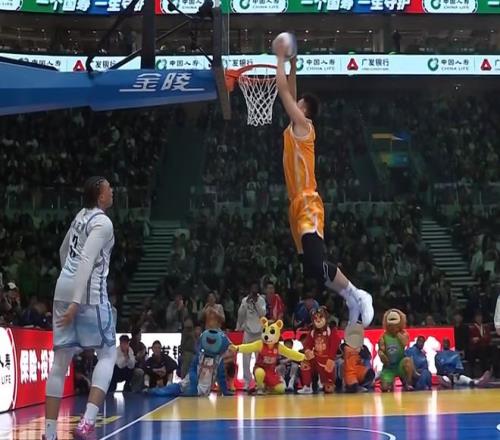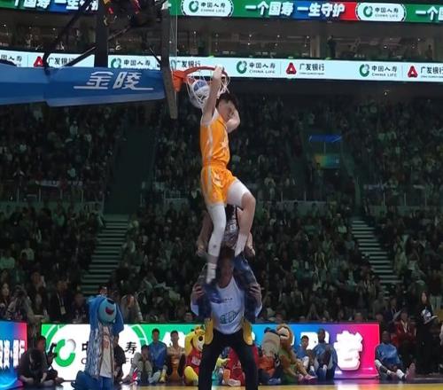 第二个张鼎岩,他叫了两个人叠在一起,陈登星在上面,球也是陈登星拿着。张鼎岩出发后弹跳高度非常高,后续还接了一个背身反扣,轻轻松松获得50分。