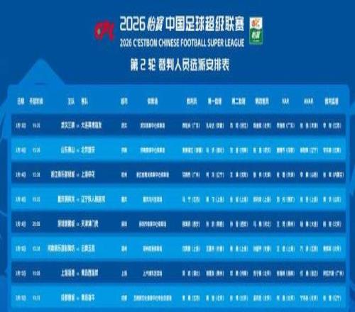 闪电体育3月13报道今日,中超第2轮裁判安排出炉,麦麦提江主哨焦点大战山东泰山vs北京国安,VAR唐顺齐,本场比赛将于3月14日周六15:30进行。