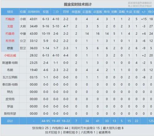 本赛季湖人和掘金交手3次,湖人2胜1负。最后看看数据: