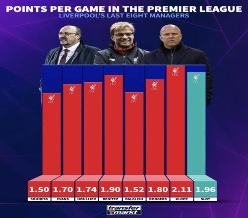 最近德国转会市场发布了利物浦近8任主帅英超场均积分排名。克洛普以2.11分排在第一,斯洛特1.96分排在第二,贝尼特斯1.90分排在第三,后面几位主帅的数据也咬得很紧。只看英超场均积分,先后顺序已经摆出来了;可把冠军数量、接手时的球队状态和最近的带队表现一起放进来,这几个人排在一起,谁的分量更足?