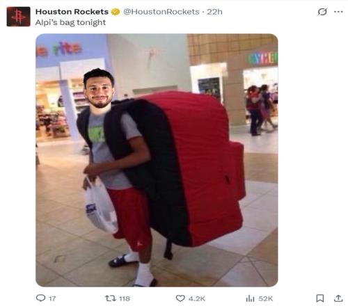 休斯顿火箭队官方晒出申京背着巨大背包的照片盛赞他一人扛起了火箭队。