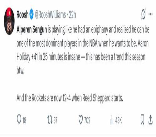 火箭队以二连胜结束了四连客之旅,火箭也在战绩方面追平了西部第五的森林狼,只要森林狼再输一场火箭就能重返西部第五。对阵鹈鹕一战杜兰特三节打卡只拿20分6助攻4篮板,而申京全场比赛32分钟拿到36分13篮板,他才是火箭的真基石。