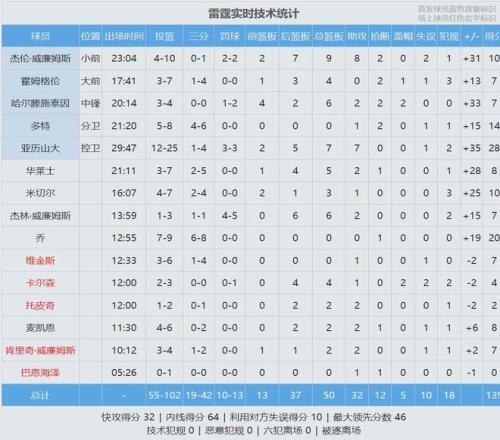 第二节雷霆再轰38分,半场打完,雷霆82-51领先湖人31分。里夫斯7中5拿到14分4失误,东契奇9中2得到10分4板5助4失误,詹姆斯3中1拿到8分3板2助2失误。湖人上半场罚球18中15,三分16中4;雷霆罚球10中9,三分19中9。