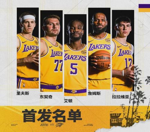 这是湖人和雷霆本赛季第三次交手,前两次交手湖人分别输了29分和9分。五天之后,4月8日湖人和雷霆还要再打一次。湖人本场首发:东契奇、里夫斯、詹姆斯、拉拉维亚、艾顿。雷霆首发:亚历山大、多尔特、杰威、切特、哈滕。