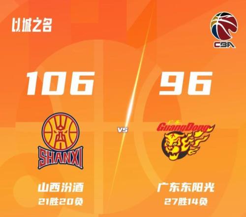 参考资料:CBA联盟 山西汾酒106-96广东东阳光