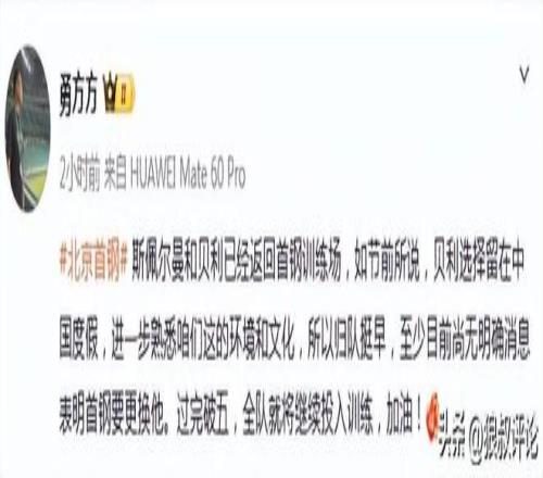 北京时间2月21日,根据北京记者勇方方的报道,“斯佩尔曼和贝利已经返回首钢训练场,如节前所说,贝利选择留在中国度假,进一步熟悉咱们这的环境和文化,所以归队挺早,至少目前尚无明确消息表明首钢要更换他。过完破五,全队就将继续投入训练,加油! ”