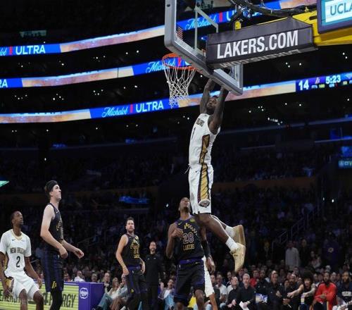 末节初端,湖人这边进攻不顺,被鹈鹕抓住机会一举领先到了8分,锡安反击上篮2+1打成,湖人暂停。暂停以后,湖人这边海斯先扣了,里夫斯进三分,老詹两罚不中以后,东契奇小抛投得分,湖人回敬一波12-0的小高潮。鹈鹕暂停,回到比赛,老詹空接,锡安篮下反篮止血,斯玛特关键三分命中领先到了7分,东契奇单挑墨菲三分还有杀死比赛。